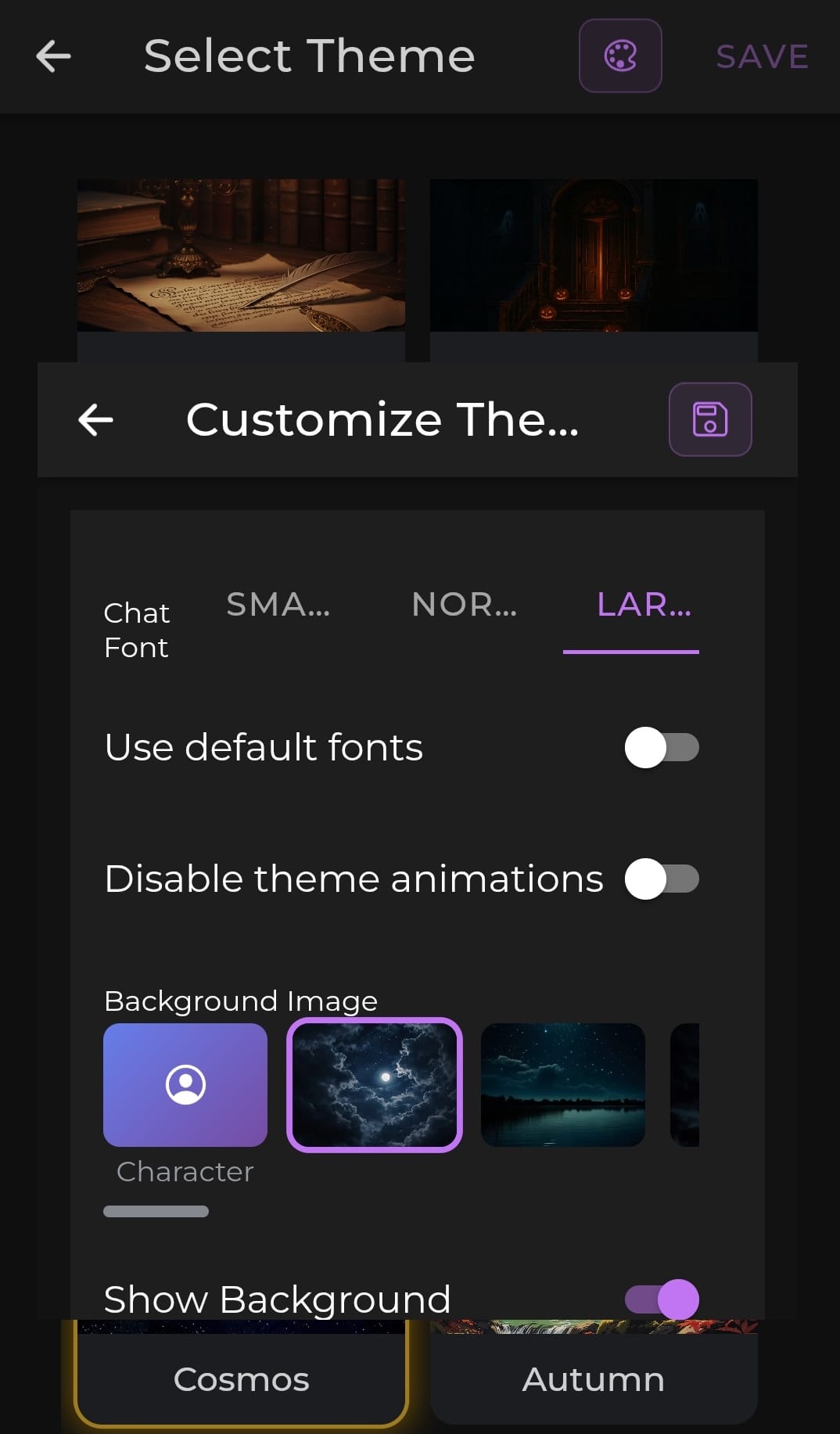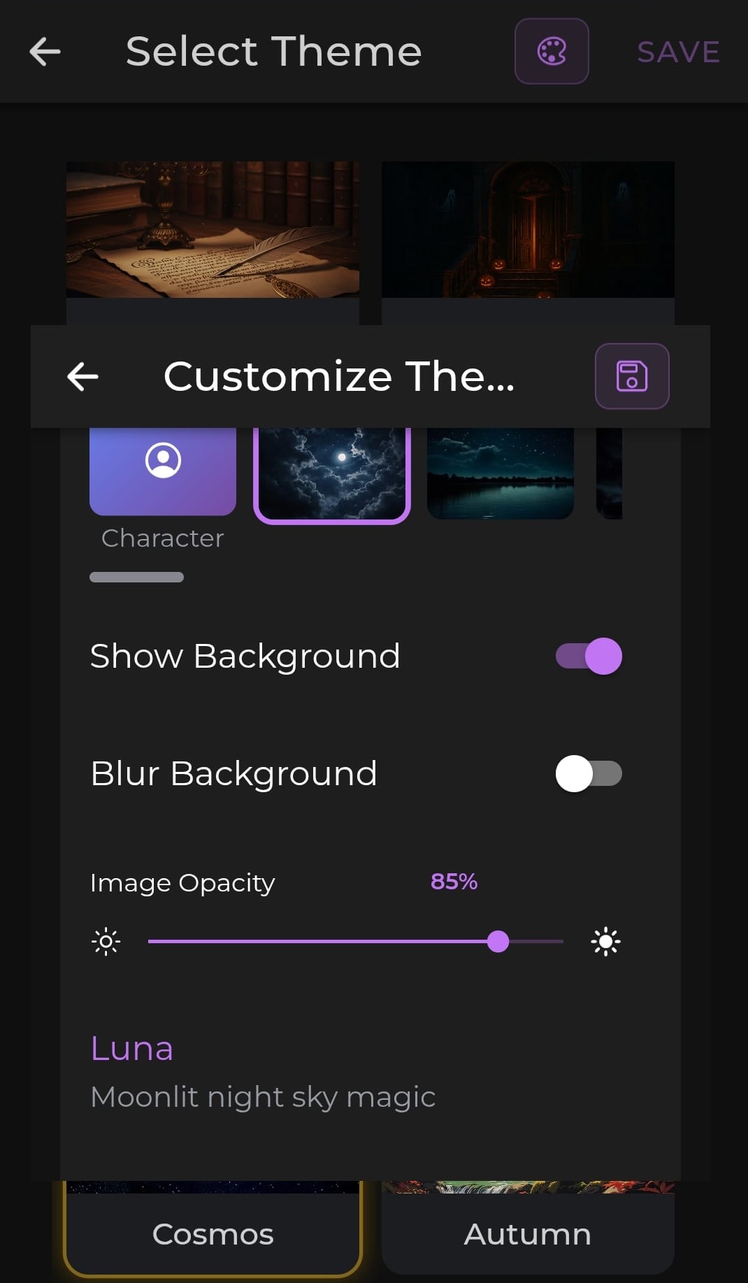 When browsing themes, tap the Customize button (🎨 palette icon) in the top-right corner of the theme selector to open the customization panel for the theme you've selected. Adjust it to your liking, then tap Save from within the customization panel to apply everything.